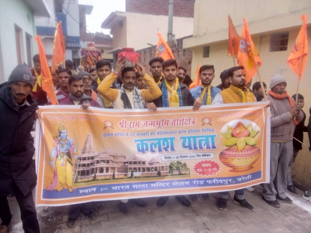 इस उपलब्क्ष मे 1 जनवरी से 15 जनवरी तक श्रीराम अयोध्या से आए अक्षत को प्रत्येक हिन्दू परिवार के घर घर जाकर पहुंचाने का कार्य करेंगे और 22 जनवरी को सभी हिन्दू लोग अपने घर को दिपावली की तरह दीपको से सजायेंगे। कलश यात्रा मे विश्व हिंदू परिषद के जिला अध्यक्ष मानवेंद्र सिंह राणा,अनिल प्रताप सिंह , अमित पांडे बबलू ,आंवला सांसद धर्मेंद्र कश्यप , ब्रह्ममेद्र मिश्रा ,अभिमन्यु सिंह ,संजय सिंह चौहान , ओमवीर सिंह गुर्जर ,हिंदू जागरण मंच के प्रांत उपाध्यक्ष जितेंद्र सिंह चौहान , शिव कुमार भाटी नगर अध्यक्ष अनूप कुमार गुप्ता, सत्यपाल सिंह यादव , पुत्तू लाल,मोहित शर्मा ,आर पी शर्मा, जबर सिंह , ब्लाक अध्यक्ष राकेश शंखधार , शिवम शर्मा , विश्व हिंदू परिषद के नगर अध्यक्ष सोमपाल राठौर ,हिंदू जागरण मंच वीरांगना वाहिनी की जिला अध्यक्ष मंजू सिंह , प्रांत कार्यकारिणी सदस्य मीना शर्मा , जिला उपाध्यक्ष संगीता कश्यप,नगर अध्यक्ष पूनम गुत्ता, दिपाली शर्मा, प्रीति शर्मा, सुनील श्रीवास्तव, भुवनेश्वर सिंह, रवि कुमार, आदि रहे।